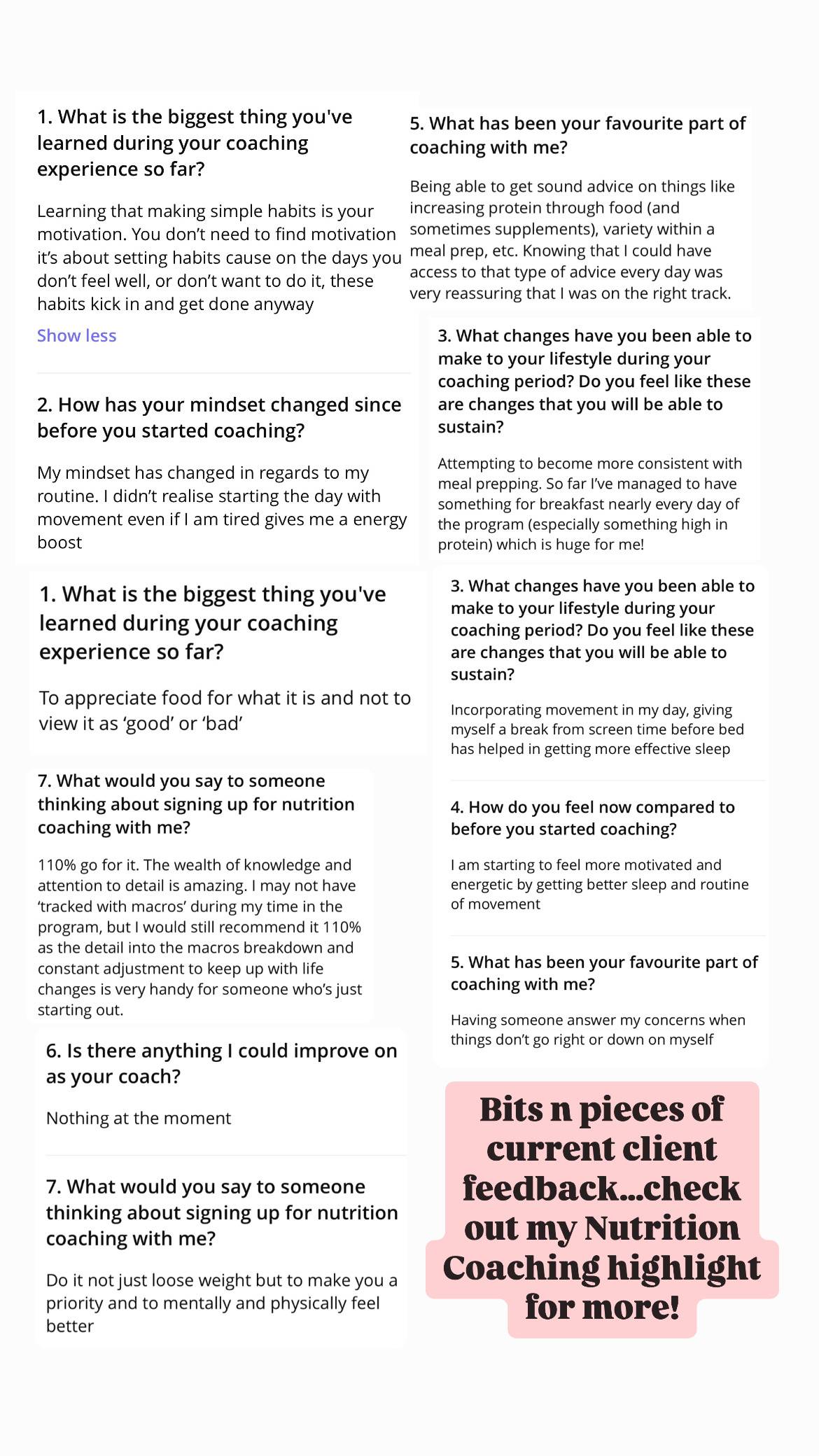 | Check out my nutrition coaching services!I can't wait to show you that it is possible to improve your relationship with food and reach your body composition, health and fitness goals in a sustainable, healthy and enjoyable way that fits in with your lifestyle! You check out my 1:1 coaching options to suit a range of needs and budgets and join my waitlist through the button below. You will be contacted via email when a space becomes available (please make sure to regularly check your junk folder too!). All prices are in Australian dollars. PLEASE NOTE - For Once-Off Programs of custom fat loss & maintenance macros + detailed personalised recommendations and comprehensive guides and meal plan examples to get you started, please click here. |